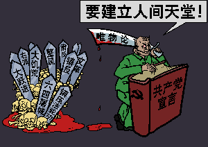 更具有讽刺意味的是,高喊“唯物”的中共,本身就并不“唯物”。讲究“物质决定意识”的中共,从来都把作为意识形态的宣传部门看得比农业部门要重要得多。在唯物主义的旗帜下,中共却一再犯着“唯意志论”的错误——“人有多大胆,地有多大产”、“一天等于二十年”、“跑步进入共产主义”等等。彭德怀因认为这些口号“浮夸”、“小资产阶级狂热”,以及不符合经济法则和科学规律,被毛泽东将其打为“反党集团”,并在全国开始“反对右倾机会主义”。最后直接导致了三千多万人饿死的大饥荒,这实乃中共“唯心”的结果。