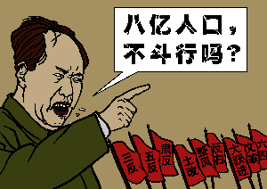 中共并非为“斗争”而斗争。这里至少有两个目的:人们在互相的斗争中失去信任,变成一盘散沙,便于中共控制;更重要的是,中共耍了一下赵高“指鹿为马”的权术。承认“指鹿为马”的赵高可放心重用;沉默不语的人显然良心未泯,赵高要加以排斥;反对者都被赵高杀掉。然而,赵高的“指鹿为马”只是宫廷权术,而中共的“指鹿为马”却成了强迫全民参与的“大众文化”。如“土改”、“镇反”、“工商业改造”、“戏剧界的改制改人改戏”等诸多运动,都是一次次“指鹿为马”的检验。每个人都必须参加、必须表态。在非此即彼的二元世界中,不跟中共站在一起的就立即成为斗争对象。