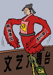 共产党认为文艺是上层建筑的一部分,只能为统治阶级的利益服务。中共夺取政权以后,从经济上把文艺演出团体收归国有,从组织上把文艺界人士变成“体制内人”并对他们实行思想改造,在创作上对文艺界耳提面命严密控制,在短时间内把所有的文艺形式,如电影、戏剧、歌舞、曲艺等,都变成国家机器的一部分和灌输党文化的工具。