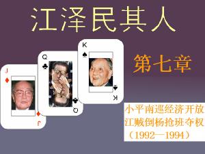 1992年春夏之际,中共总书记江泽民的政治行情一落千丈,有人已在议论江泽民的总书记位置是否还能保得住了。6月21日,李先念在北京病死。江泽民被形势所逼改变了态度,言不由衷地声称支持邓小平的改革开放路线,但还是比其他人晚了很多。江泽民后来对自己可能下台的消息还是越想越怕,寝食难安,更担心什么时候老账新账一起算,说不定还要受到党内大批判。于是江泽民又偷偷去找邓小平,做了“深刻”检讨,眼含热泪表明誓死紧跟邓小平,把改革开放进行到底。