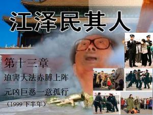 江泽民一意孤行镇压法轮功,给中国和世界带来巨大灾难。法国著名预言家诺查丹玛斯在其预言诗《诸世纪》中写到,“1999年7月,恐怖大王从天而降……。”那一年7月20日,太阳系呈现灾难天象,九大行星连成一个巨大的十字架,而就在同一天江政权开始对法轮功的镇压,江当时发话“我就不信共产党战胜不了法轮功”。随后中国被卷入持续6年的巨大灾难,天文数字的财力物力被江拿来镇压法轮功,至今还在继续。然而法轮功和平反迫害,讲真相始终如一,以不变应万变,从未退却或消失,海外更是广传全球,日益赢得世界的理解和尊敬。