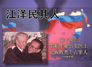 1999年12月9日和10日,是中国人耻辱的日子。在这两天里,江泽民在北京与来访的俄罗斯总统叶利钦签定了《中华人民共和国政府和俄罗斯联邦政府关于中俄国界线东西两段的叙述议定书》(以下简称《议定书》)。那片本来完全可以如香港、澳门一样回归祖国的土地,却被江泽民为了个人的目的,背着全国人民,拱手奉送给俄国,断了中华民族生存发展的后路。