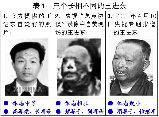 2002年初,记者李玉强(自焚案采访者)在河北省会法制教育培训中心(强迫法轮功学员放弃信仰的洗脑班)采访,被非法关押的法轮功学员追问自焚案的种种漏洞,李不得不承认:“王进东”腿间的雪碧瓶子是她们放进去“补拍”的。
