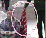 通过慢镜头可以看见,刘春玲身上的火焰已基本熄灭,突然,有人用重物猛击她的头部。(见上页图1)刘随即倒地,一条状物快速弹起,飞出。(见上页图2)谁是出手之人?如果把镜头止住,可以看见挥动的手臂接近刘的头部,穿军衣的武警正走向镜头前,他身后,一名身穿大衣的男子正好站在出手投掷重物的方位,仍保持一秒钟前用力的姿势。(见上页图4)我们还可看到,刘倒地时,左手不自觉抬起来触摸被打击部位。(见上页图3)