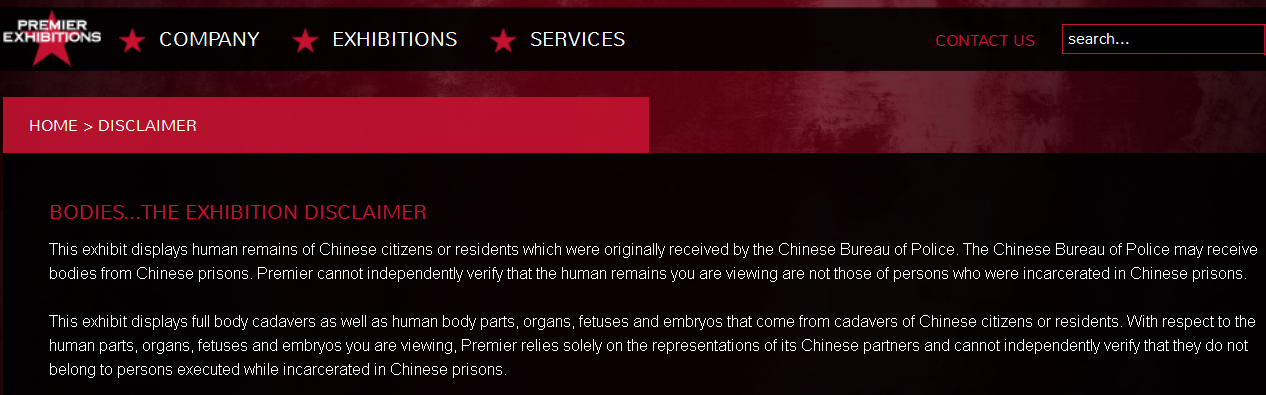 原文:This exhibit displays full body cadavers as well as human body parts, organs, fetuses and embryos that come from cadavers of Chinese citizens or residents. With respect to the human parts, organs, fetuses and embryos you are viewing, Premier relies solely on the representations of its Chinese partners and cannot independently verify that they do not belong to persons executed while incarcerated in Chinese prisons.