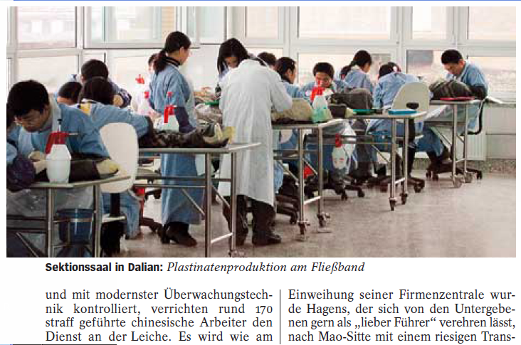 2004年德国《明镜周刊》记者通过现场调查指证[15]:在哈根斯的公司储存着的“胚胎和胎儿”数据库里,有一具9个月大的胎儿标本详细记录。该标本编号01BR01。2001年3月26日存进该公司仓库,性别为男性,国籍为“中国境内”(inlaendich),“来源”为“警察局”。9个月大的胎儿怎么会来自警察局?