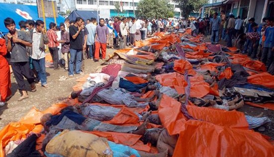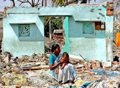 大海啸灾后 一位母亲抱着孩子坐在废墟上