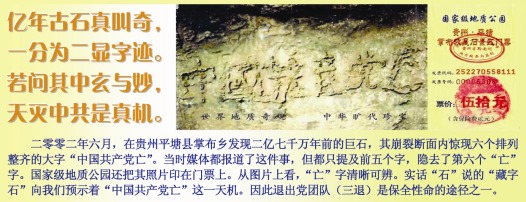 听说过天灭中共吗?“藏字石”不就是显露的天灭中共的天机吗?预言中也预言到中共的灭亡,和天灭中共时其追随者被一同诛灭的可怕惨景。中国共产党不是一个空壳,它是由加入该组织的党、团、队员组成的,天灭中共时,这些人该怎么办?那么神就要给人一个选择的机会。是抛弃邪恶、选择光明,还是随着邪党一同被消灭,对于这个关系到每个人的生死的问题,朋友,您想过吗?